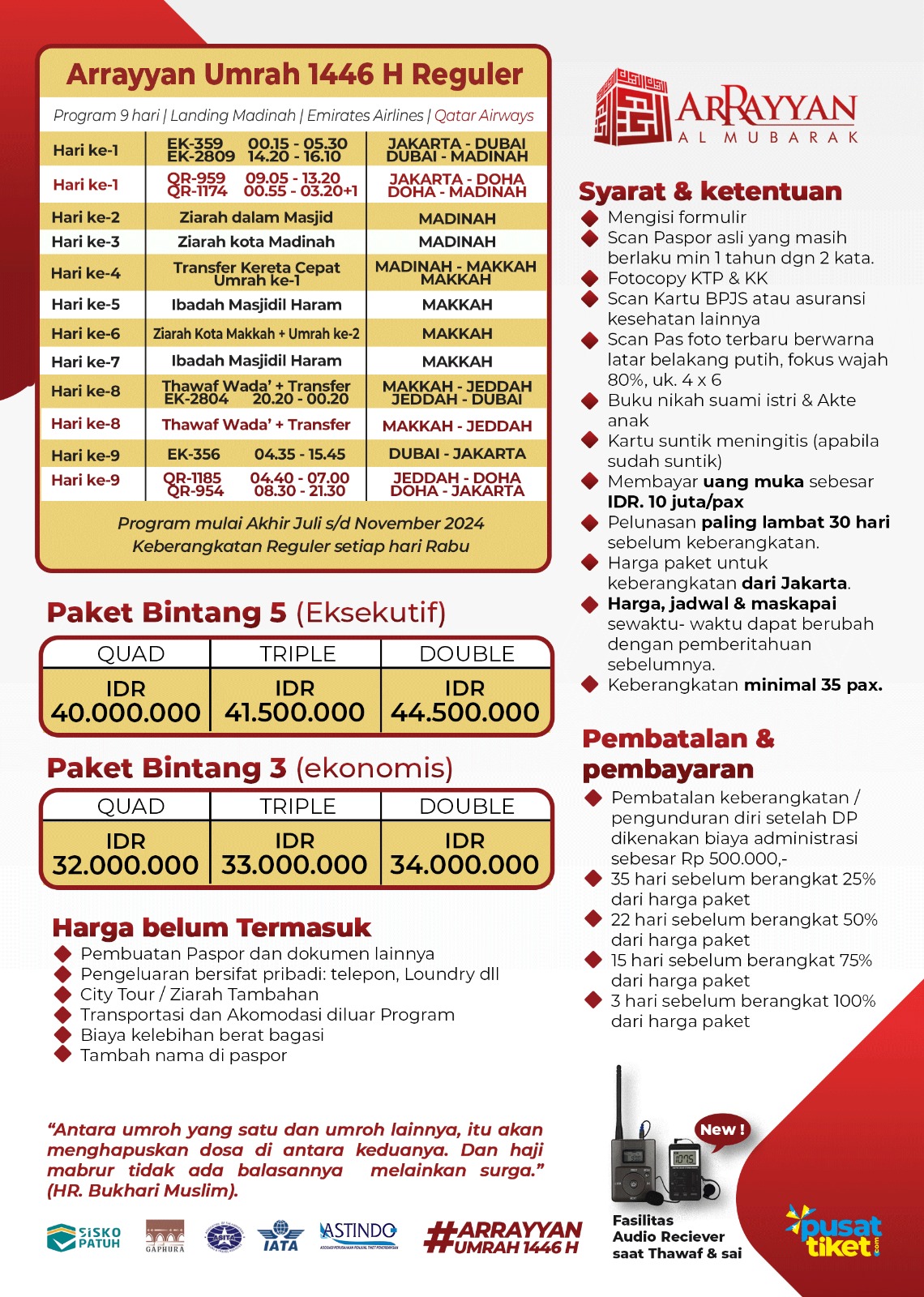 - Pelunasan paling lambat 30 hari sebelum keberangkatan.
